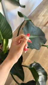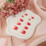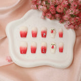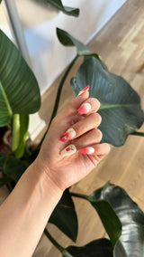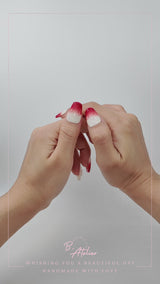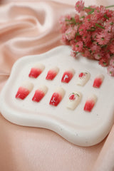 De smukke røde ombré-effekter glider over i en blød cremefarvet base. De små ferskenmotiver på udvalgte negle tilføjer et legende og charmerende touch, perfekt til dig, der elsker unikke detaljer.